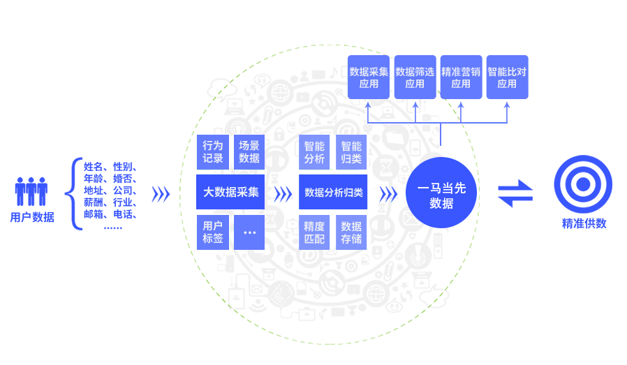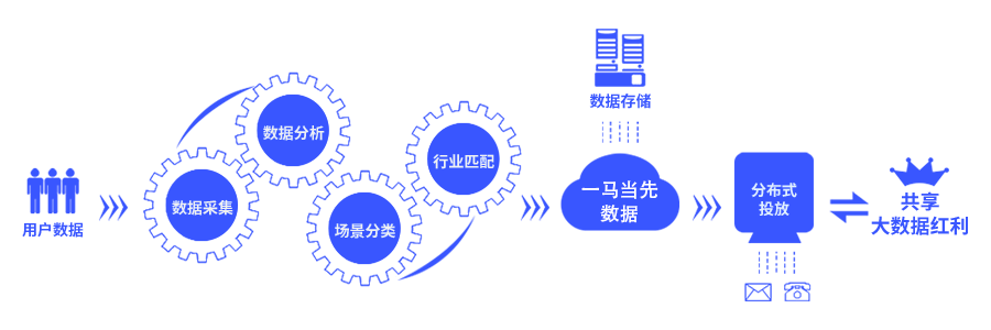 应用自主研发的最新数据清洗、特征识别、建模算法,对用户进行采集、分析,进行行业匹配,分布式投放,降低成本,并持续应用最新的技术成果,共享大数据红利。